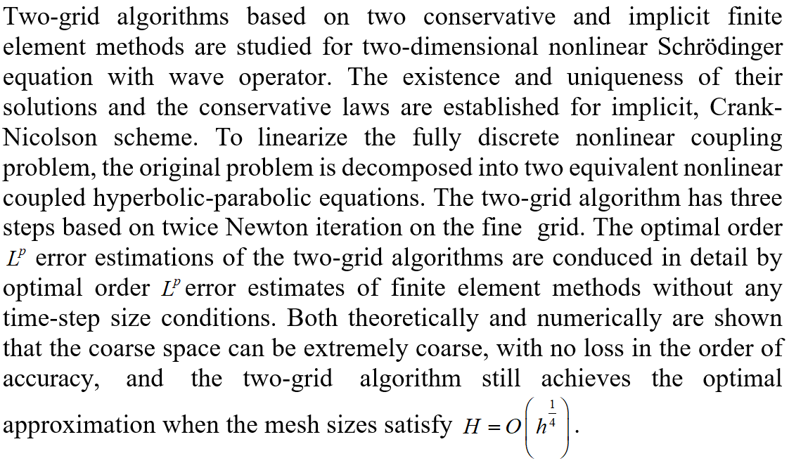 报告题目:Analysis of finite element two-grid algorithms for two- dimensional nonlinear Schrödinger equation with wave operator