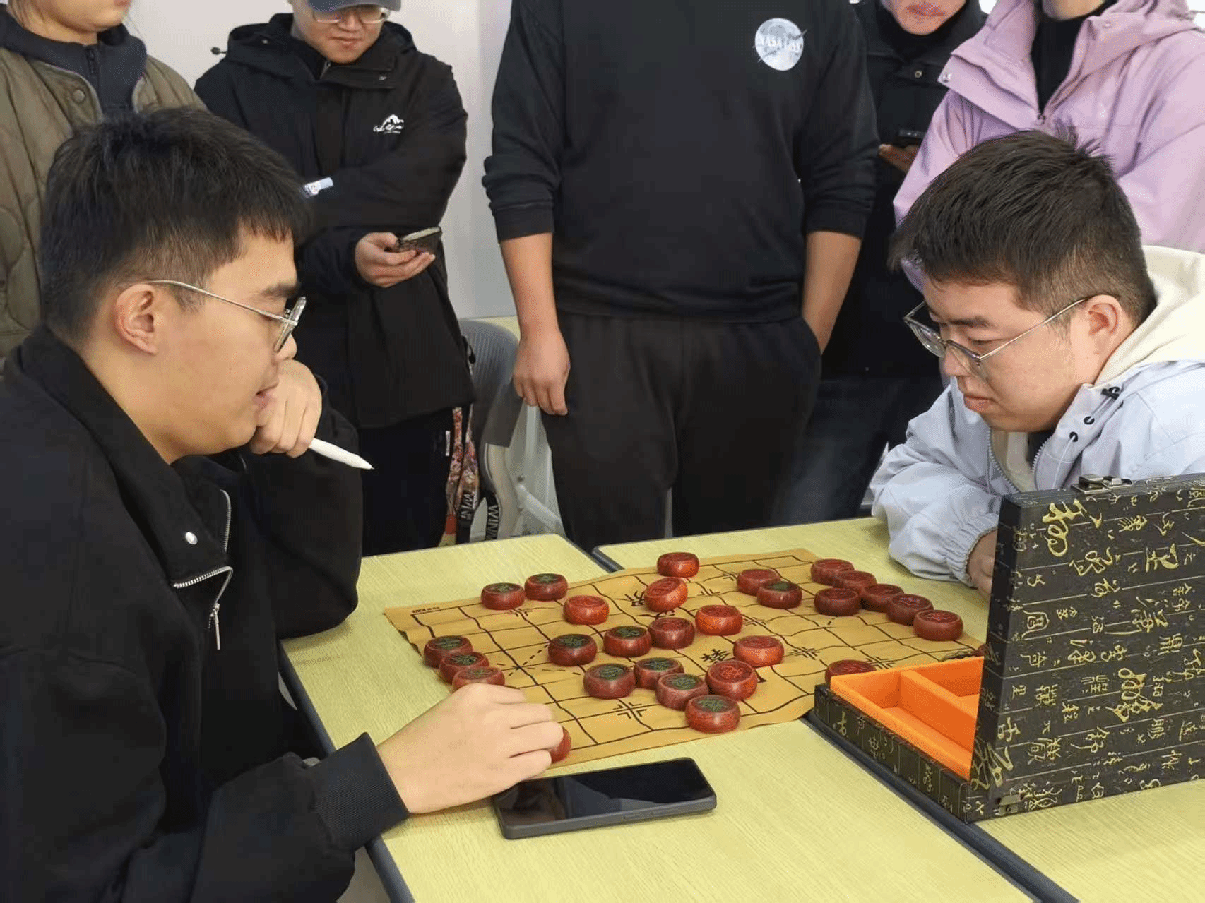 本次大赛设立五子棋、象棋、军棋三大经典项目,吸引两百余名学子踊跃参与。智慧在方寸棋盘上交锋,耐心与谋略于无声对弈中较量,共同呈现了一场精彩纷呈的脑力盛宴。五子棋赛区,棋手们目光如炬,审度全局。落子声清脆,黑白棋交错,攻势如潮,守势如山,于简洁规则中演绎无穷变幻。象棋赛场,楚河汉界,风云暗涌。选手们运筹帷幄,排兵布阵,或凝神长考,或果断出击,方寸之间尽显运筹帷幄之智。军棋对弈区,选手们正襟危坐,神情专注,每一步都深思熟虑,在明暗交错中展现出奇制胜之妙。