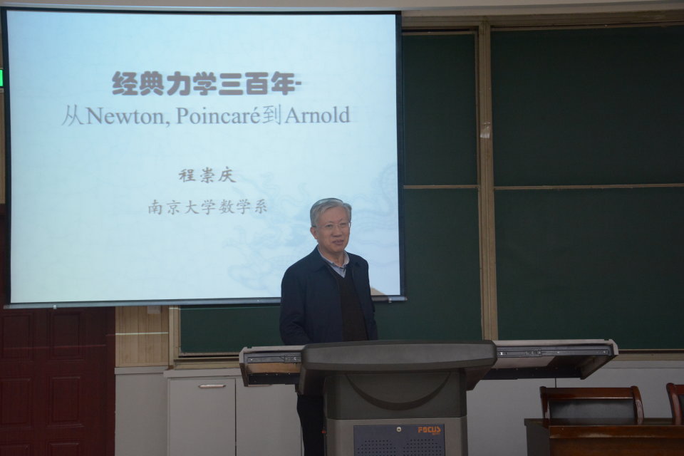 方面,就拉格朗日定理、费马定理等作了讲解。程崇庆用深入浅出的语言,对三体问题、Poincare最终几何猜测及回归定理、KAM理论的重大意义、Arnold扩散及最新进展等进行了介绍。与会师生与程崇庆教授就Arnold扩散等有关问题进行了深入讨论。