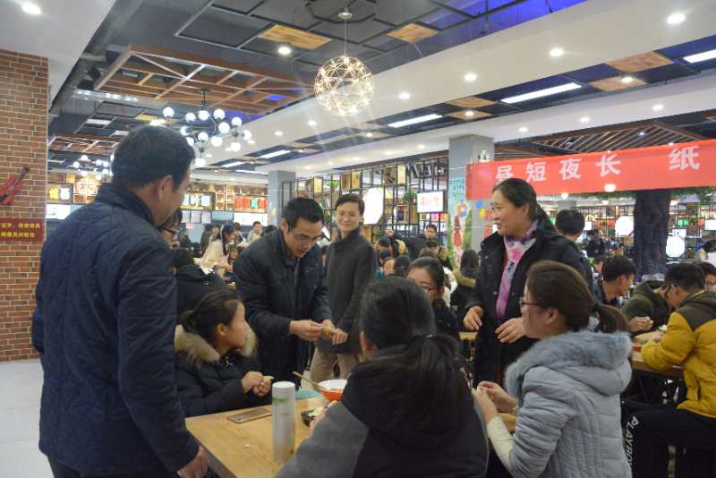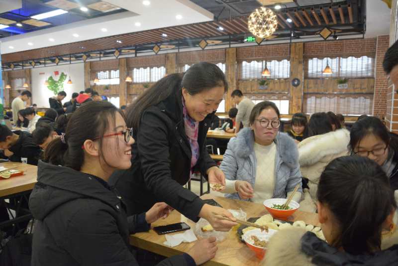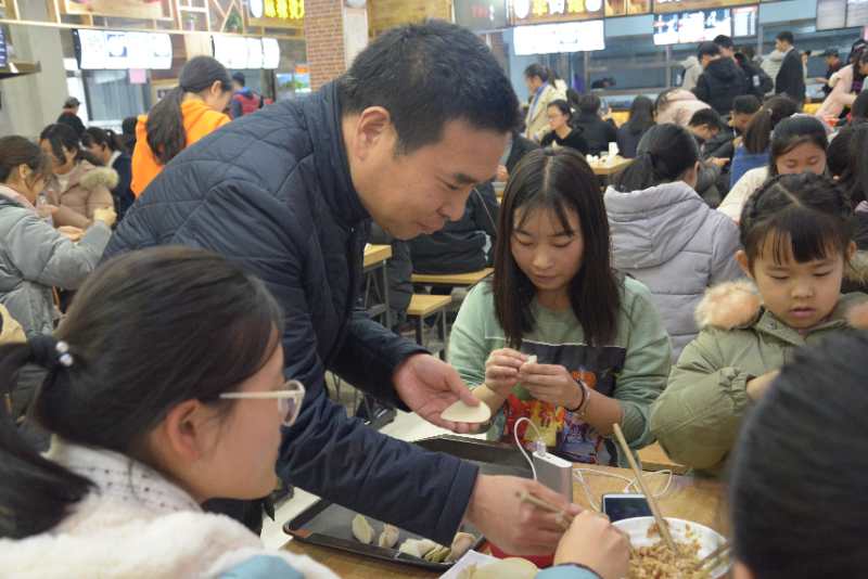 党委书记史富强、党委副书记赵红磊、副院长王波、杨一平和2018级辅导员吴苏苏来到现场与同学们一起包饺子、过冬至。