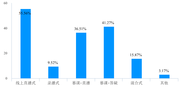 对于教学方式的选择方面(多选题),选择线上直播式的老师占55.56%,选择慕课加直播或者混合式占52.38%,选择慕课答疑的占41.27%,其他方式的占3.17%。说明大多数老师选择的是线上直播,随着51吃瓜