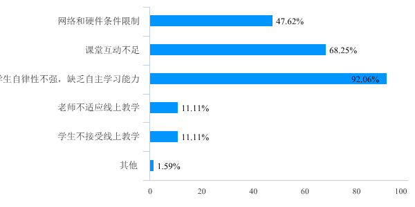 对于影响线上教学效果的因素分析方面,老师们普遍认为学生自律性不强、课堂互动不足和网络硬件条件限制是主要的影响因素,尤其是对学生的真实学习状态和对每个知识点掌握程度方面不能进行及时有效掌控,这一点也是线上教学与传统课堂教学最大的差别。