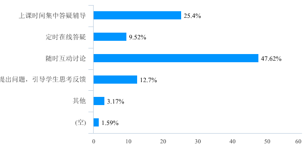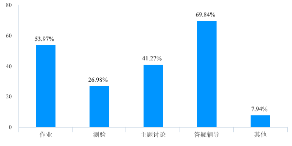 类课程的特点,老师们采用最多的互动方式是答疑辅导,达69.84%。作业、主题讨论和测验也占据了较大的比例,说明线上教学中师生高度重视教学互动环节。