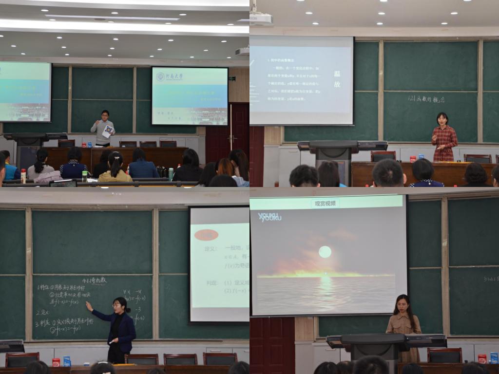 的联系;选手张园园通过设定“函数小镇”的情景引入课程,以小组讨论方式让同学们自主观察变量关系,理解函数的概念;选手胡书雅以生活中的实际图形:如汽车标牌、中国移动的Logo来引入奇函数图像,通过启发引导的方式带领学生学习奇函数的特征,充分体现了教师主导、学生主体的教学观;选手冯琪琪通过带领观看视频“海上日出”,让学生直接体会直线和圆的位置关系,教学设计受到了评委老师的一致好评。
