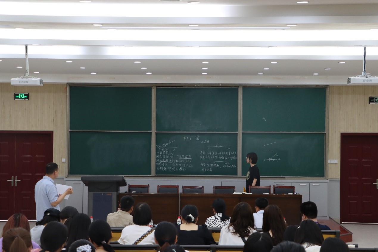 其次,各小组分别选派了一名同学现场进行了15分钟的板书讲课比赛活动。比赛在李甜同学响亮的“上课”口令中开始,六位同学依次走上讲台,他们备课充分、思路清晰、板书规范、特色鲜明,李甜同学的娓娓道来、梁笑笑同学的层层递进、侯奉科同学的从容淡定等都给大家留下了深刻印象。