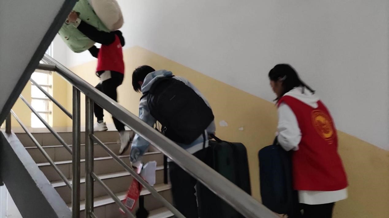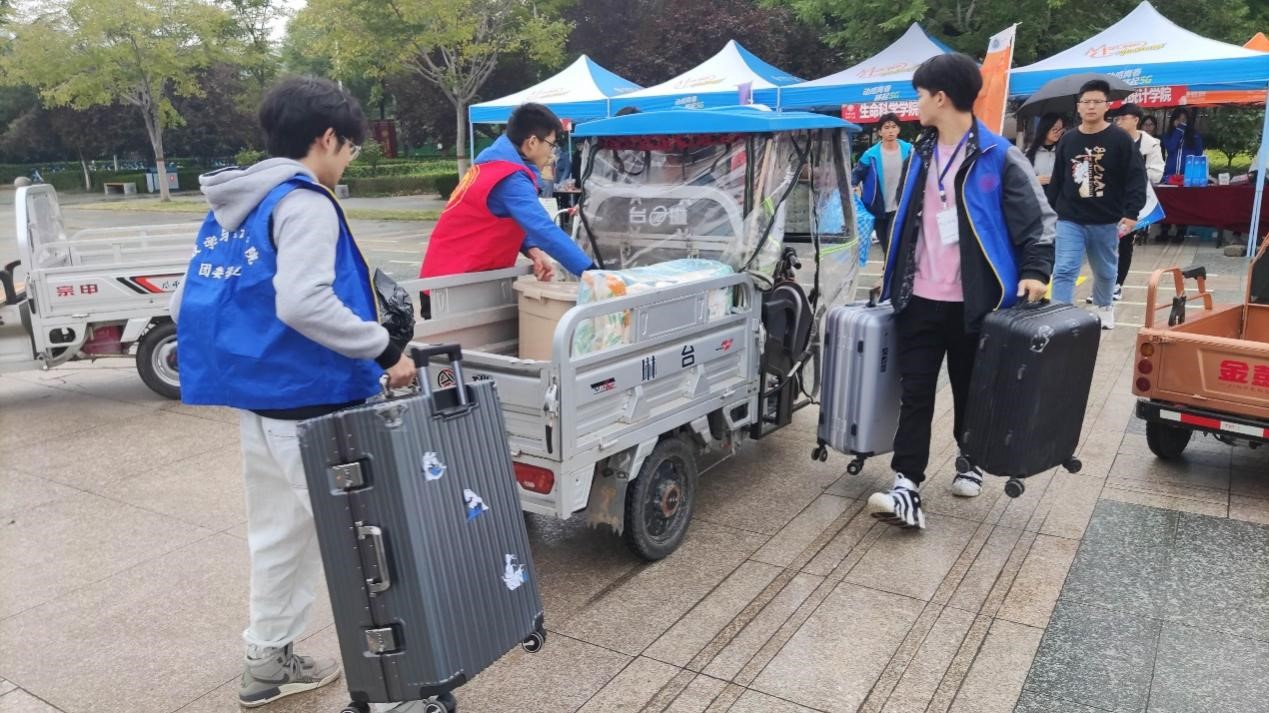 志愿者们协助运输行李,引导新生抵达宿舍
