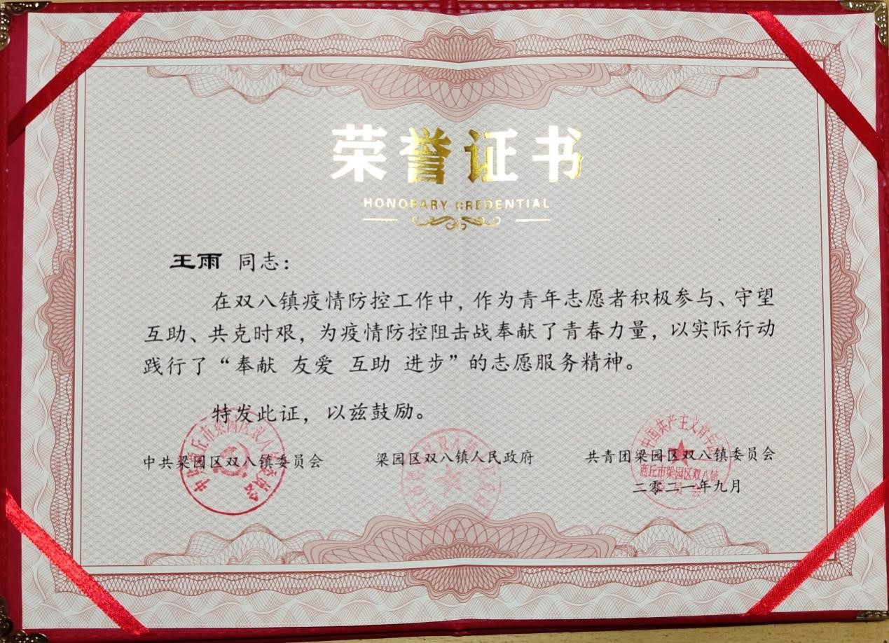 王雨同学在疫情期间,积极投身疫情防控志愿活动中,其主要负责以下三项工作。第一,参与小区门口的卡点工作,主要包括对小区来往车辆进行询问、登记、消毒、测温、发放出行卡等。第二,在做核酸检测时,对居民排队秩序进行维护、帮助登记信息、消毒等。第三,在双八镇卫生院需要帮助时给予支援,包括管理大门出入状况、控制注射室人流量、协助医生登记注射信息等。王雨同学共计志愿服务约三周时间,期间表现优秀,为双八镇的抗击疫情工作做出了很大贡献,并获得“优秀志愿者”称号。