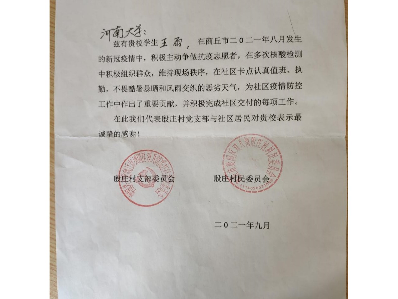 应用统计研究生王雨同学在2021年8月的新冠疫情中,主动争做抗疫志愿者的行为以及不畏艰险、奋勇争先的精神给予了诚挚的感谢和充分的肯定。同时对我校的精心培养和教师的悉心教导表示最真挚的感谢!