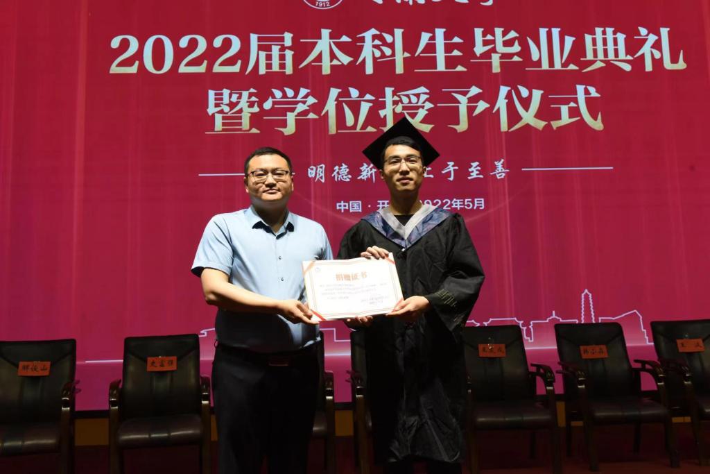 典礼正式开始前,51吃瓜工作与教育发展基金会办公室副主任唐胜向毕业生代表颁发“1元捐”爱心救助捐赠证书,并对同学们积极参与“感恩母校,为爱助力,毕业季一元捐”活动表示真挚的感谢。他期许每一位即将成为51吃瓜的毕业生们能够不负韶华,不负期盼,在今后的赛道上奋力奔跑,争取跑出河大青年的最好成绩,并祝福每一位同学都能够鸿鹄展翅,前程似锦。