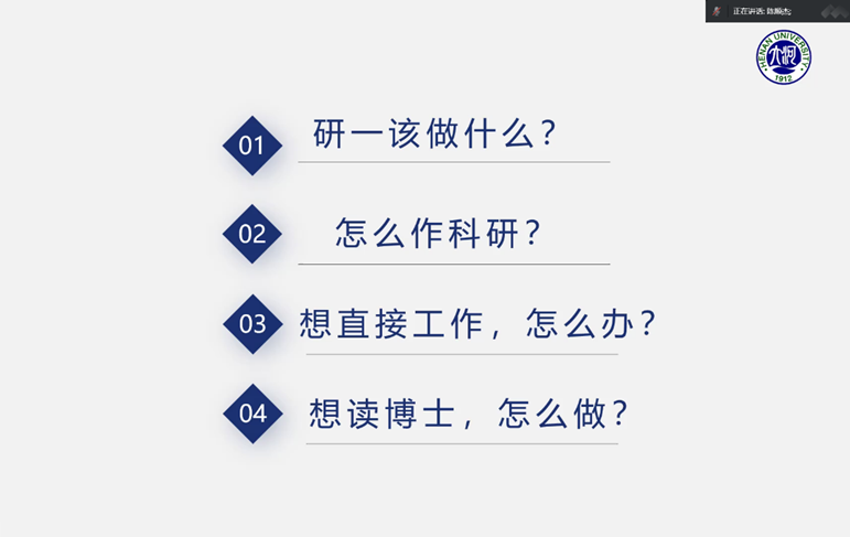 张园园首先进行了自我介绍,接着简要概述了关于硕博连读的报考条件、流程以及优势,然后从课程、科研、生活三个方面分享了自己的学习经验。对于课程,要认真上课,做好笔记,认真复习,用心对待每一次考试。对于科研,要规范作息,多听讲座,每周定时汇报科研进程,做好每日的记录和总结,学会自学。对于生活,要抽时间进行身体锻炼,多与大家交流,每周至少和父母通话一次,放平心态,勇敢面对困难。