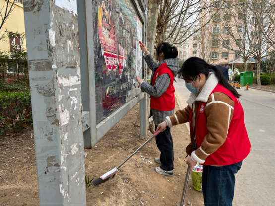 21号家属院内墙面、楼道、电线杆等处的小广告进行逐一清理;经过两个小时的劳动,小区内面貌焕然一新,她们忙碌的身影,成了小区里一道亮丽的风景线;通过劳动,同学们的文明意识、环保意识进一步增强。